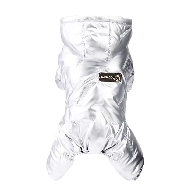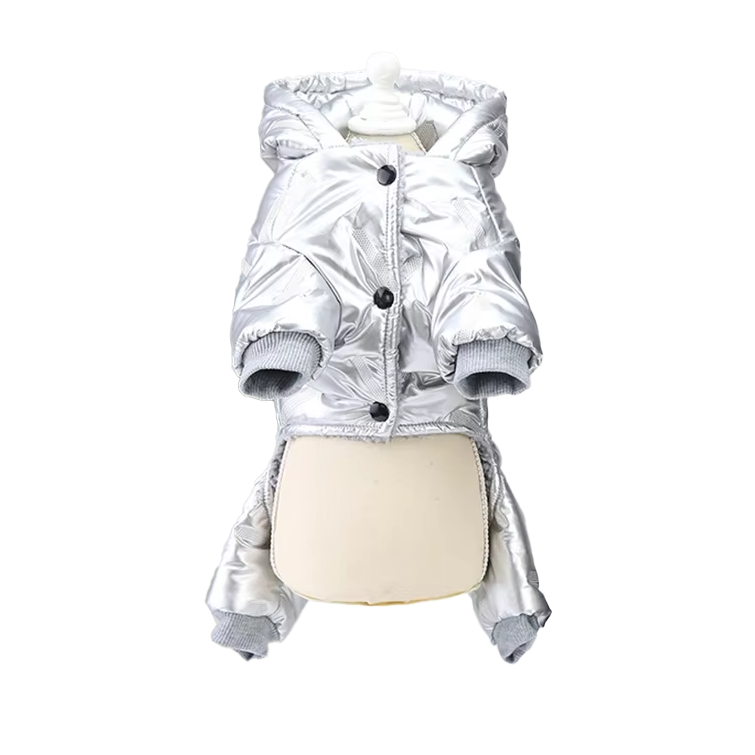 Комбинезон-пуховик для собак от бренда УЮТ в стильном цвете серебристый металлик — это сочетание модного дизайна и надежной защиты от холода для вашего питомца.