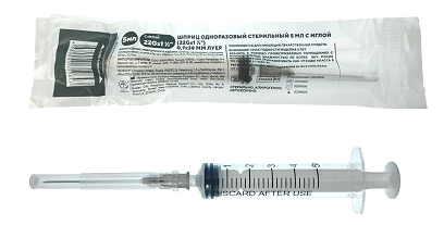 Шприц 5мл (Китай)3-х комп 90шт в упак, с иглой 22G