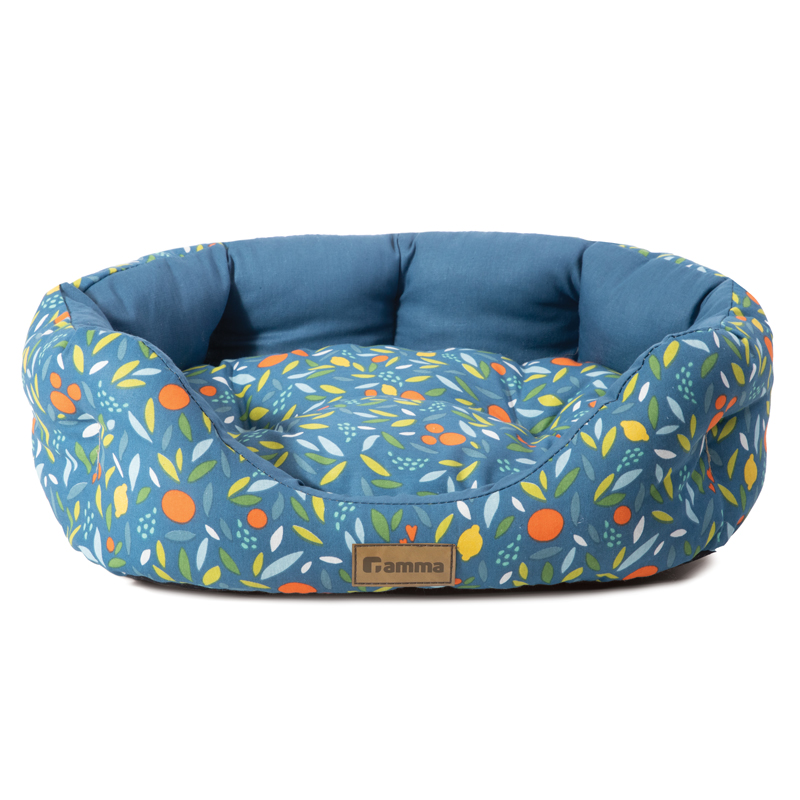 Лежанка в овальной форме выполнена в насыщенном синем цвете и украшена стильным узором с мандаринами. Бортики по краям обеспечивают дополнительную поддержку и создают уютное пространство для отдыха. Удобная съемная подушка облегчает уход и чистку. Подходит как для кошек, так и для собак, обеспечивая комфорт и защиту.