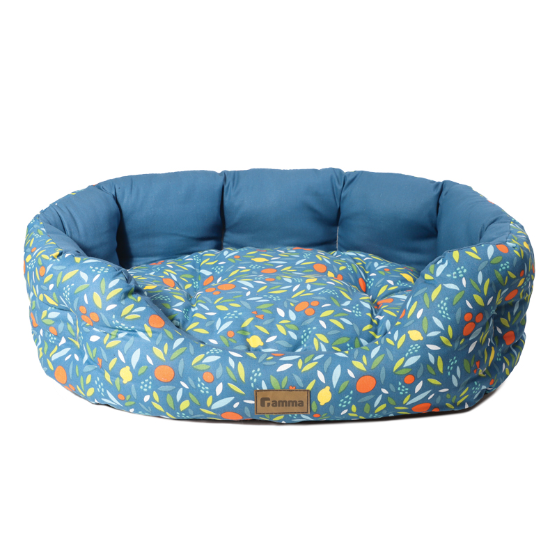 Лежанка в овальной форме выполнена в насыщенном синем цвете и украшена стильным узором с мандаринами. Бортики по краям обеспечивают дополнительную поддержку и создают уютное пространство для отдыха. Удобная съемная подушка облегчает уход и чистку. Подходит как для кошек, так и для собак, обеспечивая комфорт и защиту.