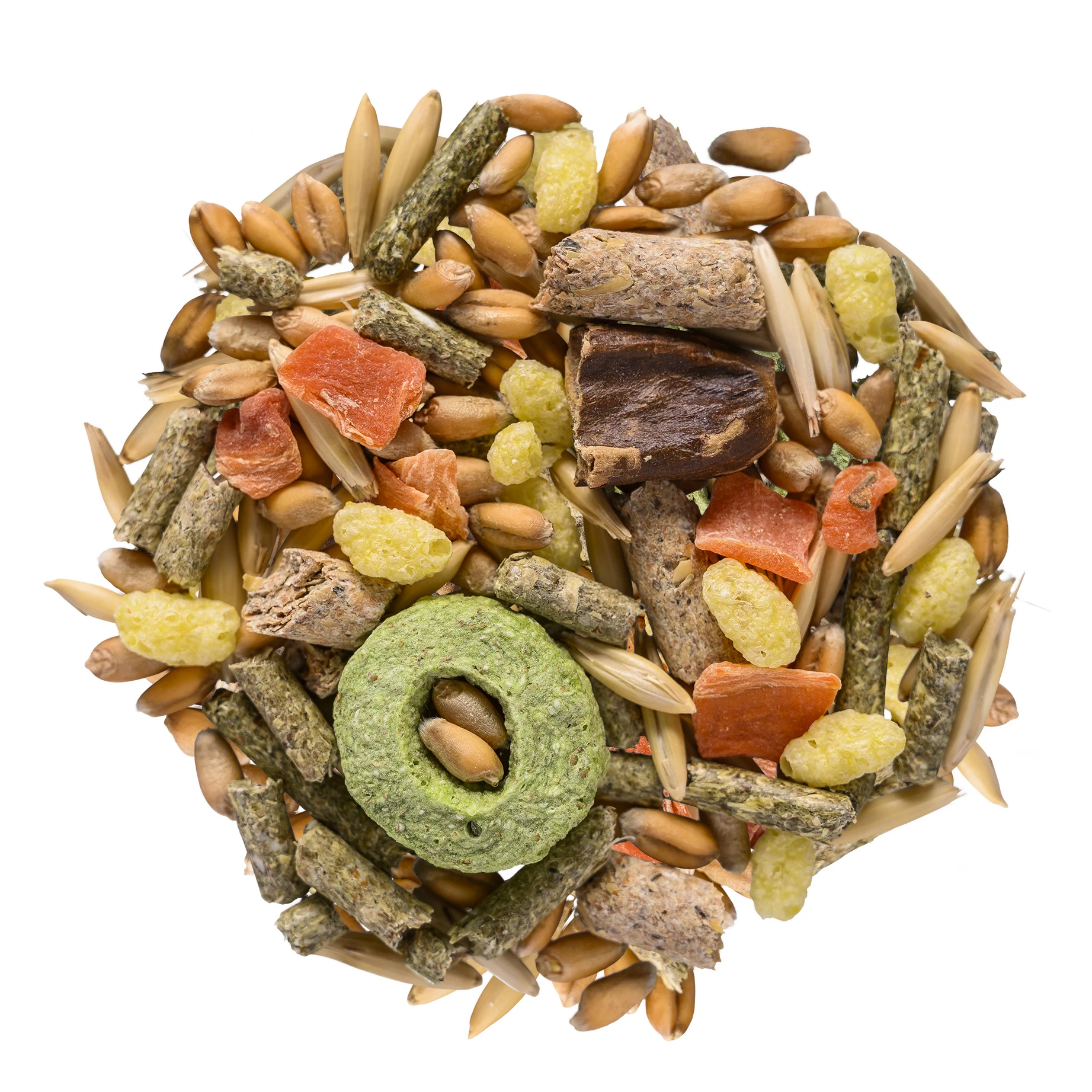 Травяные гранулы (злаковые культуры, клевер, вика, люцерна), комбикорм гранулированный (отруби пшеничные, льняное семя, костная мука, соль йодированная, дрожжи пивные и хлебные, витаминный комплекс), пшеница, овес, ячмень, сушеные овощи, зерновые хлопья, пробиотик