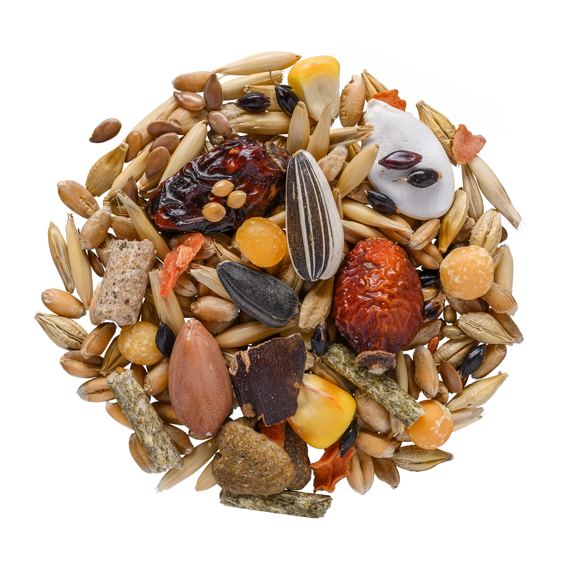 Травяные гранулы (злаковые культуры, клевер, вика, люцерна), комбикорм гранулированный (отруби пшеничные, льняное семя, костная мука, соль йодированная, дрожжи пивные и хлебные, витаминный комплекс), пшеница, овес, ячмень, подсолнух полосатый, кукуруза, льняное семя, вика, просо белое, суданка, орехи, тыквенное семя, сушеные фрукты овощи, пробиотик