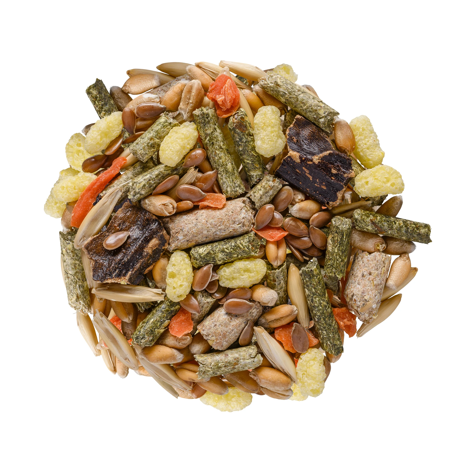 Травяные гранулы (злаковые культуры, клевер, вика, люцерна), комбикорм гранулированный (отруби пшеничные, льняное семя, костная мука, соль йодированная, дрожжи пивные и хлебные, витаминный комплекс), пшеница, овес, ячмень, сушеные фрукты овощи, зерновые хлопья, пробиотик