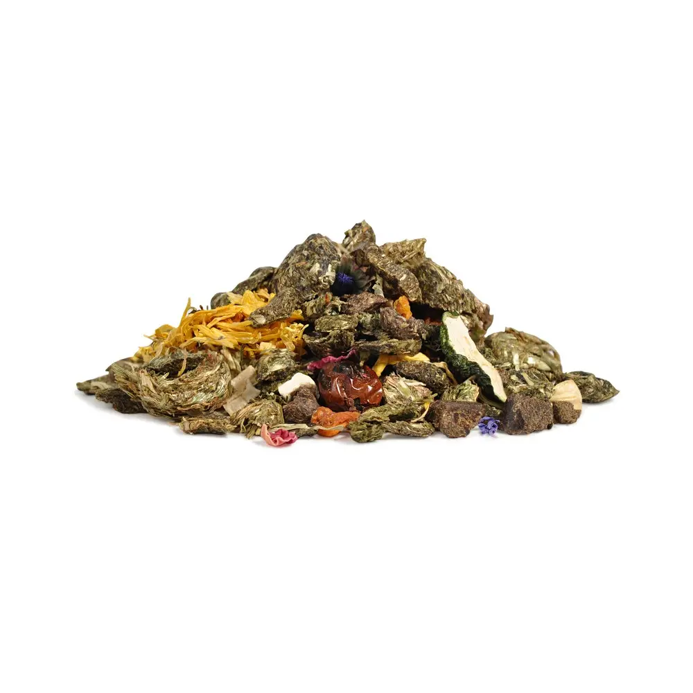 Состав: луговые и горные травы, яблочные выжимки, мука из семян подсолнечника, семя льна, льняное масло, фруктоолигосахариды (0,9%)., сушеная тыква (1,4%), сушеный пастернак (1,4%), сушеное яблоко (1%), цветы календулы (0,9%), шиповник (0,7%), сушеный цуккини (0,7%), цветы василька (0,7%), лепестки розы (0,2%), дрожжевой экстракт (0,75%), экстракт юкки (0,01%).