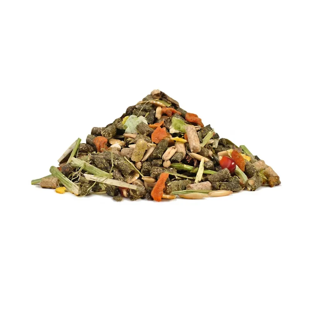 Травяные гранулы, ячмень плющеный, овёс плющеный, хлопья кукурузные, горох плющеный, плоды рожкового дерева (кэроб), морковь сушёная, мультизерновые гранулы, кукуруза красная, яблоко сушёное, люцерна сушёная, фруктоолигосахариды, экстракт юкки