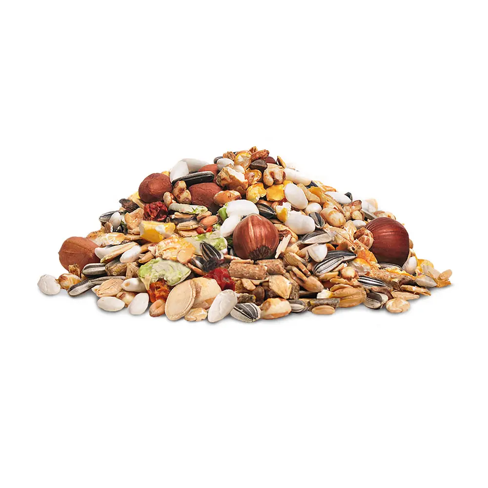 Пшеница, ячмень плющеный, овсянка, семена подсолнечник, гранулы мультизерновые, гречиха, кукурузные хлопья, горох плющеный, пшеница воздушная, рис воздушный, кукуруза воздушная, арахис, фундук, семечки тыквенные, морковь сушеная, рябина сушеная, яблоко сушеное, кедровый орех, фруктоолигосахариды, экстракт юкки