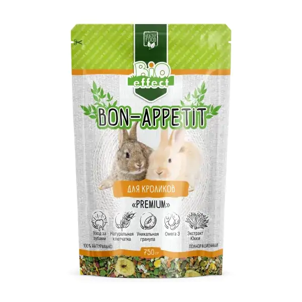 Bio Effect “Bon-Appetit” для кроликов — это полнорационный сбалансированный корм, удовлетворяющий пищевые потребности питомца, при этом в нем уже есть все нужные для ушастого витамины и минералы.