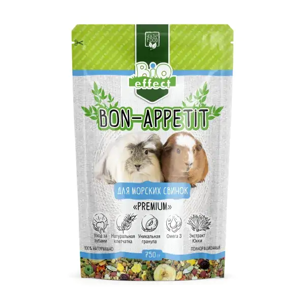 Корм Bio Effect «Bon-Appetit» моделирует естественное кормление в живой природе и именно такой корм находится в этой упаковке. Bio Effect – это выбор в пользу здорового питания. Морские свинки имеют специально приспособленный для переваривания грубых волокон относительно длинный пищеварительный тракт. Именно поэтому важно, чтобы в питании свинок содержалось много растительных волокон. В корме Bio Effect «Bon Appetit» повышенное содержание натуральной клетчатки, что способствует правильному пищеварению. Еще одна из особенностей организма морской свинки в том, что аскорбиновая кислота в нём не вырабатывается. Зверьки получают её только с пищей. Корм Bio Effect «Bon Appetit» содержит натуральные овощи и фрукты, а также обогащен витаминным комплексом, обеспечивающим здоровье питомца.