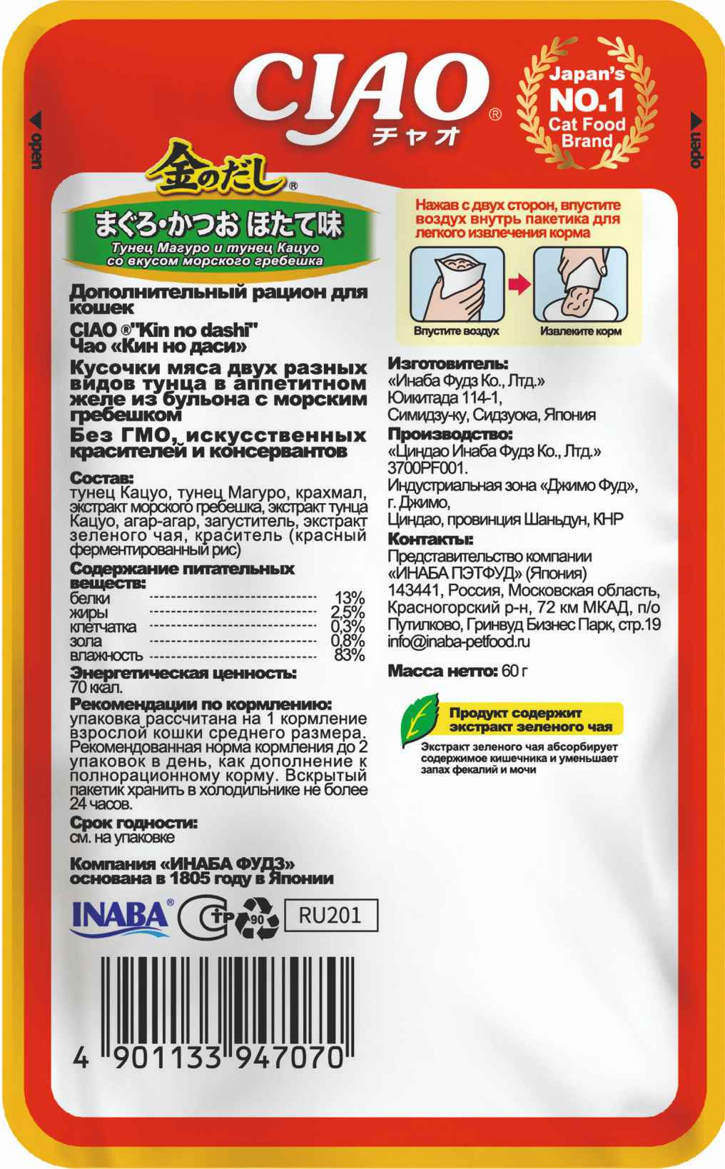 —INABA ЧАО КИННОДАСИ пауч д/кошек в желе тунец Магуро и Кацуо со вкусом морского гребешка 60гр. RU201