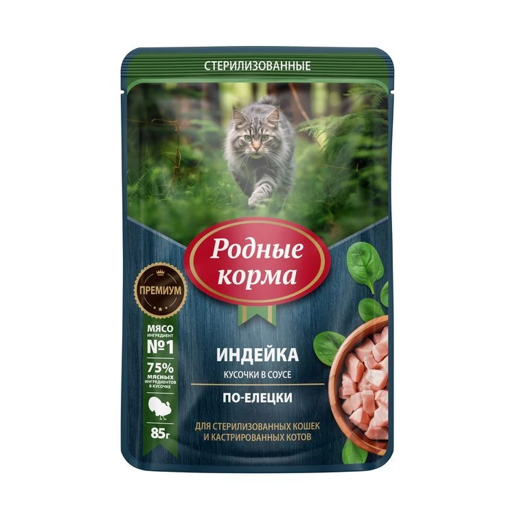 —РОДНЫЕ КОРМА для стерил кошек и кастр котов с индейкой кусочки в соусе по-елецки, 85г 1х30 пауч