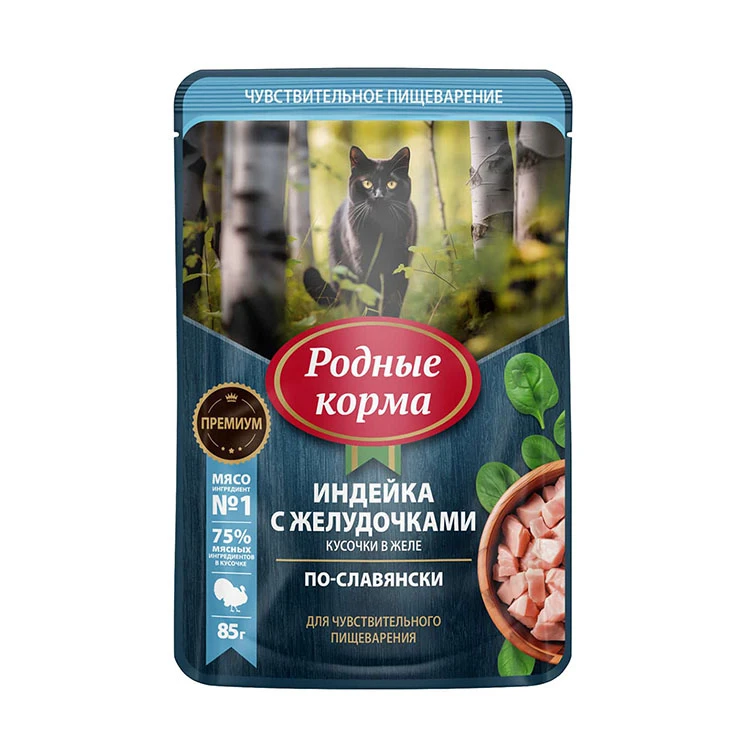 —РОДНЫЕ КОРМА для кошек с чувствит пищевар с инд и желуд кусочки в желе по-славянски 85 гр 1х30 пауч