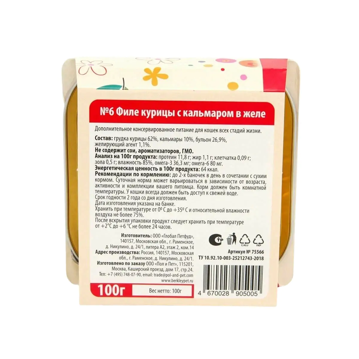 —Беркли №6 филе курицы с кальмаром в желе для кошек, ламистр 100г.