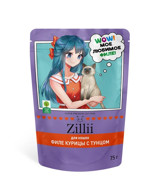 ZILLII влажные (пауч) корм для стерил кошек Мясн.волокна в желе 75г*12 Филе Курицы с Тунцом