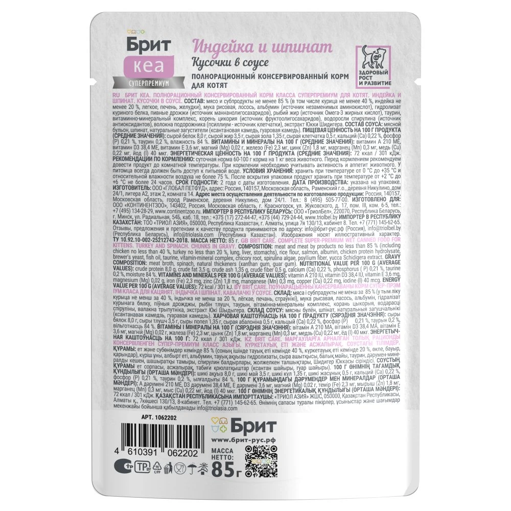 Брит КЕА Пауч для котят индейка и шпинат кусочки в соусе 85г*12
