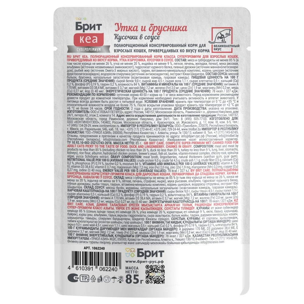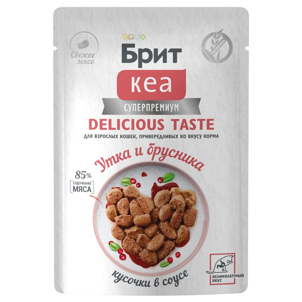 —Брит КЕА Пауч для привередливых кош утка и брусника кусочки в соусе 85г*12