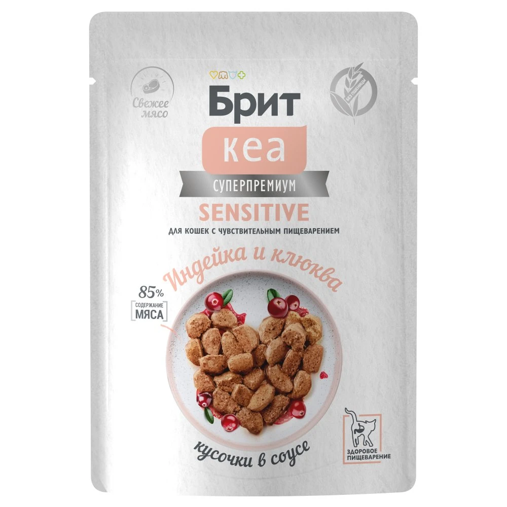 Брит КЕА Пауч для кош с чувств. пищевар. индейка и клюква  кусочки в соусе 85г*12