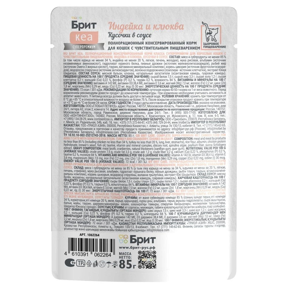 —Брит КЕА Пауч для кош с чувств. пищевар. индейка и клюква кусочки в соусе 85г*12