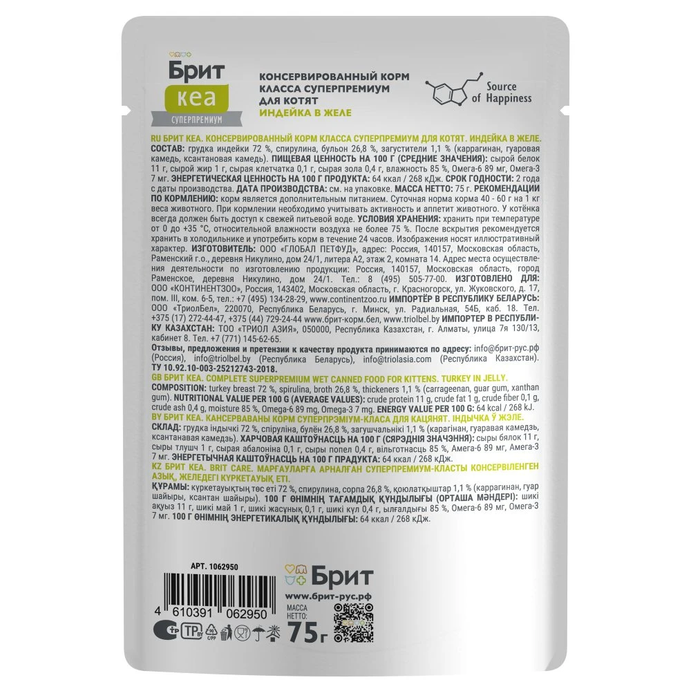 —Брит КЕА Пауч для котят индейка в желе 75г*12