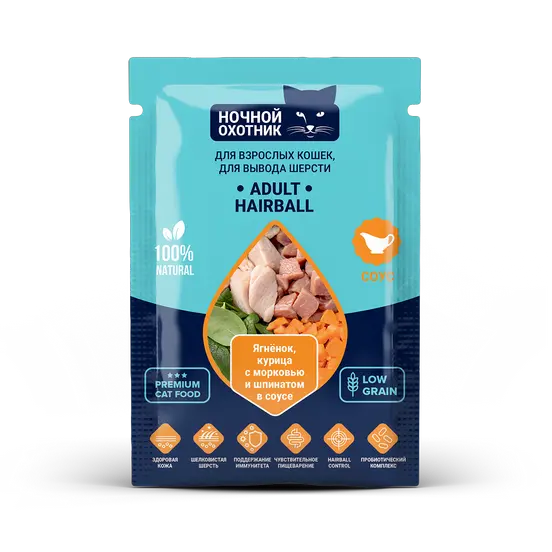 Ночной Охотник HAIRBALL д/кошек вывод шерсти кусочки в соусе Ягненок, Курица с морковью дой-пак 85гр