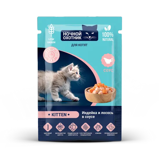Ночной Охотник Kitten д/котят от 1 месяца кусочки в соусе Индейка и Лосось дой-пак 85гр
