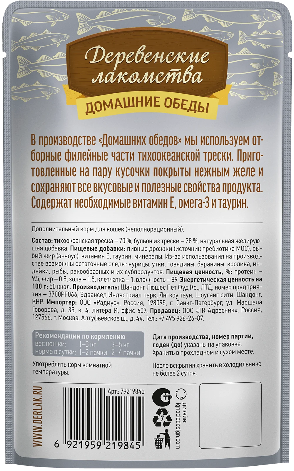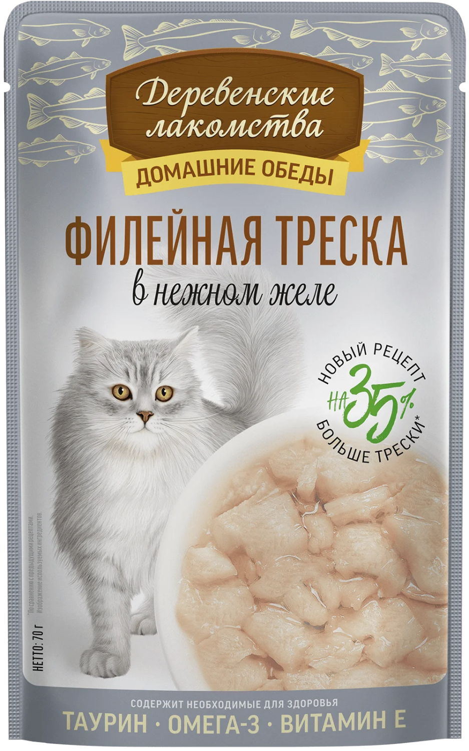 —Деревенские лакомства пауч. д/кошек Филейная треска в нежном желе, 70г