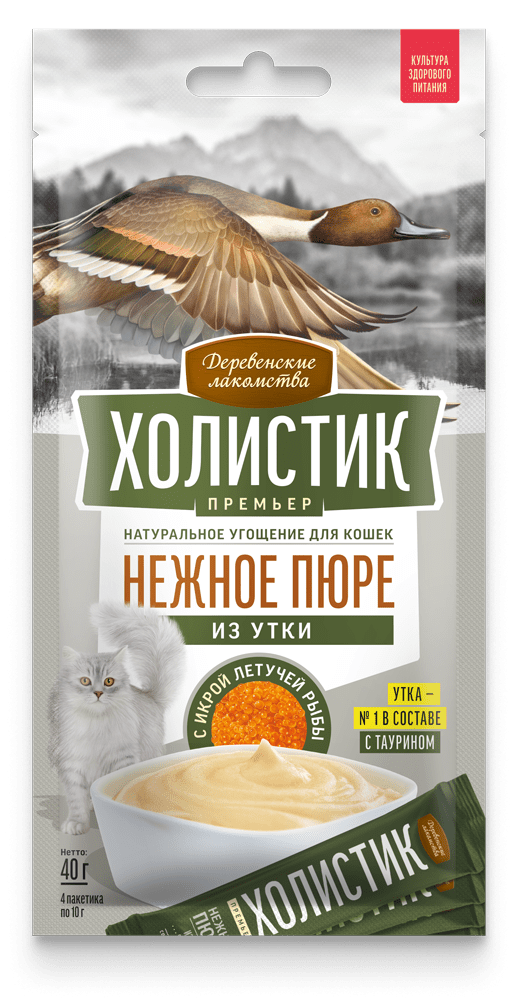 Нежнейшее пюре из отборного мяса утки, с добавлением настоящего деликатеса — икры летучей рыбы, порадует вашу кошку ярким, насыщенным вкусом. Удобная упаковка позволит вам проводить вместе незабываемые минуты, кормя вашего любимца прямо из пакетика.