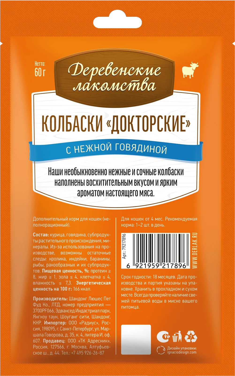—Колбаски "Докторские" с нежной говядиной д/кошек "Деревенские лакомства",60 гр