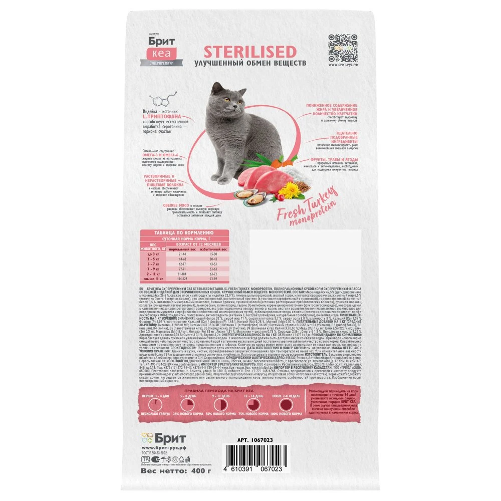 —Брит КЕА сухой корм д/стер кош с индейкой 0.4кг.STERILISED METABOLIC MONOPROTEIN