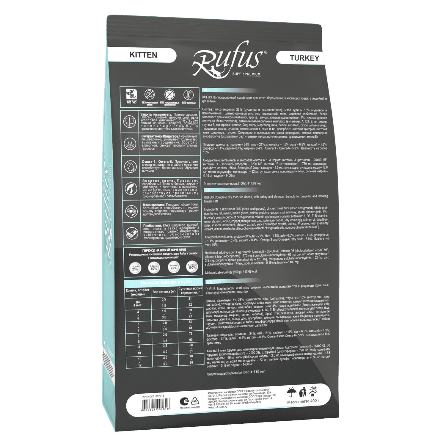 Пищевая ценность: протеин – 34%, жир – 21%, клетчатка – 1.5%, зола – 6.5%, кальций – 1.3%, фосфор – 1.1%, калий– 0.4%, натрий – 0.4%, Омега-3 и Омега-6 - 5.9%. Влажность не более 10%.
