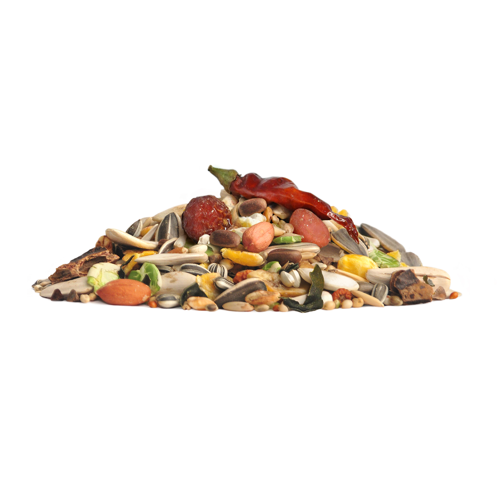 Семена сафлора, сорго белое, гречиха, семена подсолнечника, овес, рис падди, кукурузные хлопья, плющеный горох, кукуруза, кэроб, пшеница, полезные семена, красное просо, воздушная пшеница, воздушный ячмень, воздушная кукуруза, семечки тыквенные, рябина сушеная, плоды шиповника, банан сушеный, сушеный перец, арахис, кедровый орех, глюконат кальция, водоросли
