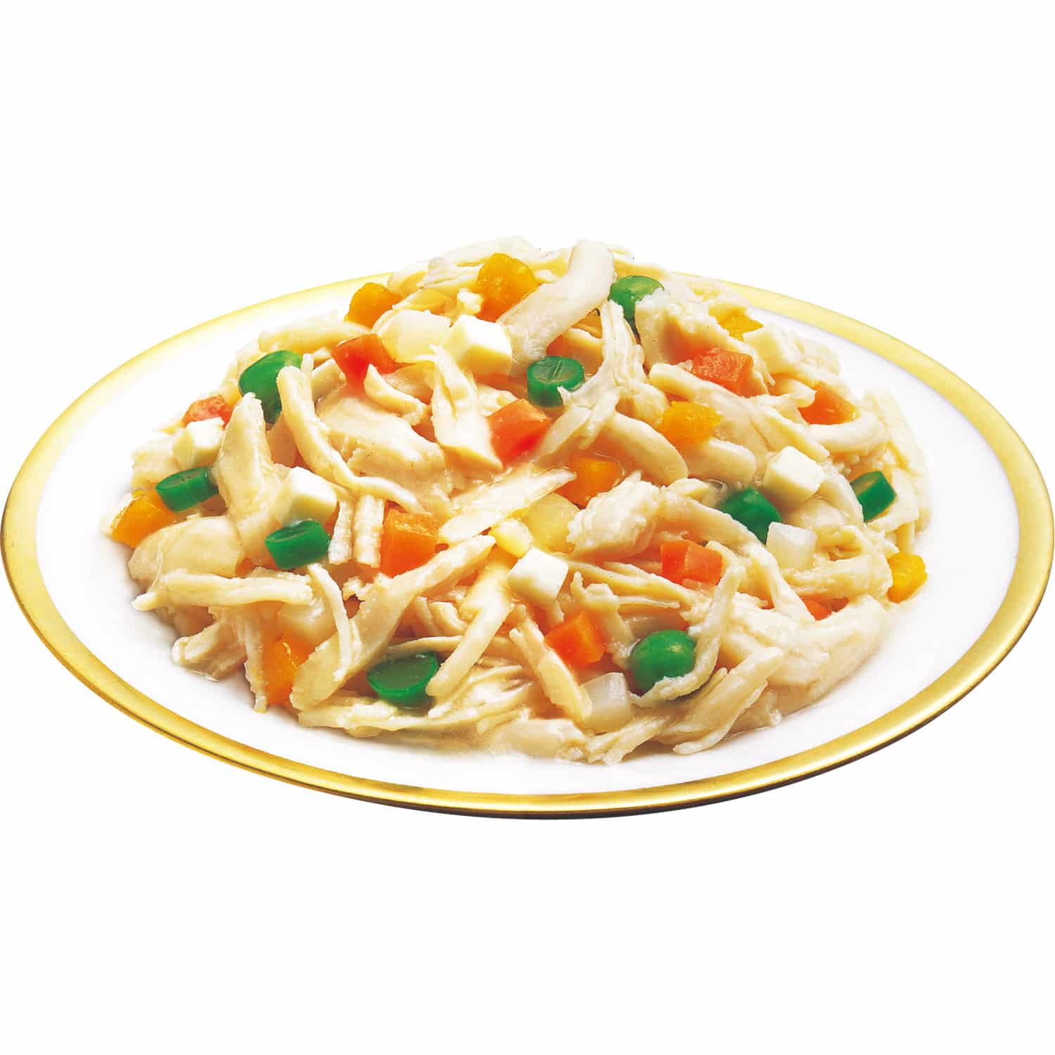куриное филе, овощи (морковь, картофель, кабачок, зеленые бобы, зеленый горох), сыр, куриный жир, экстракт курицы, агар-агар, куриный порошок, гидролизованный белок, олигосахариды, лактобактерии, минеральные вещества (Ca, Fe, Cu, Mn, Zn, I), полисахариды, витамины (A, D3, E, B6, фолиевая кислота, B12, холин, биотин), экстракт зеленого чая, красный ферментированный рис