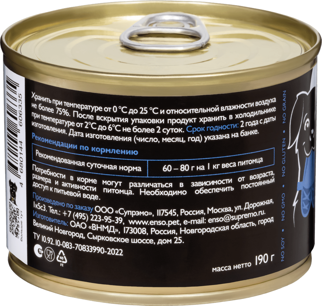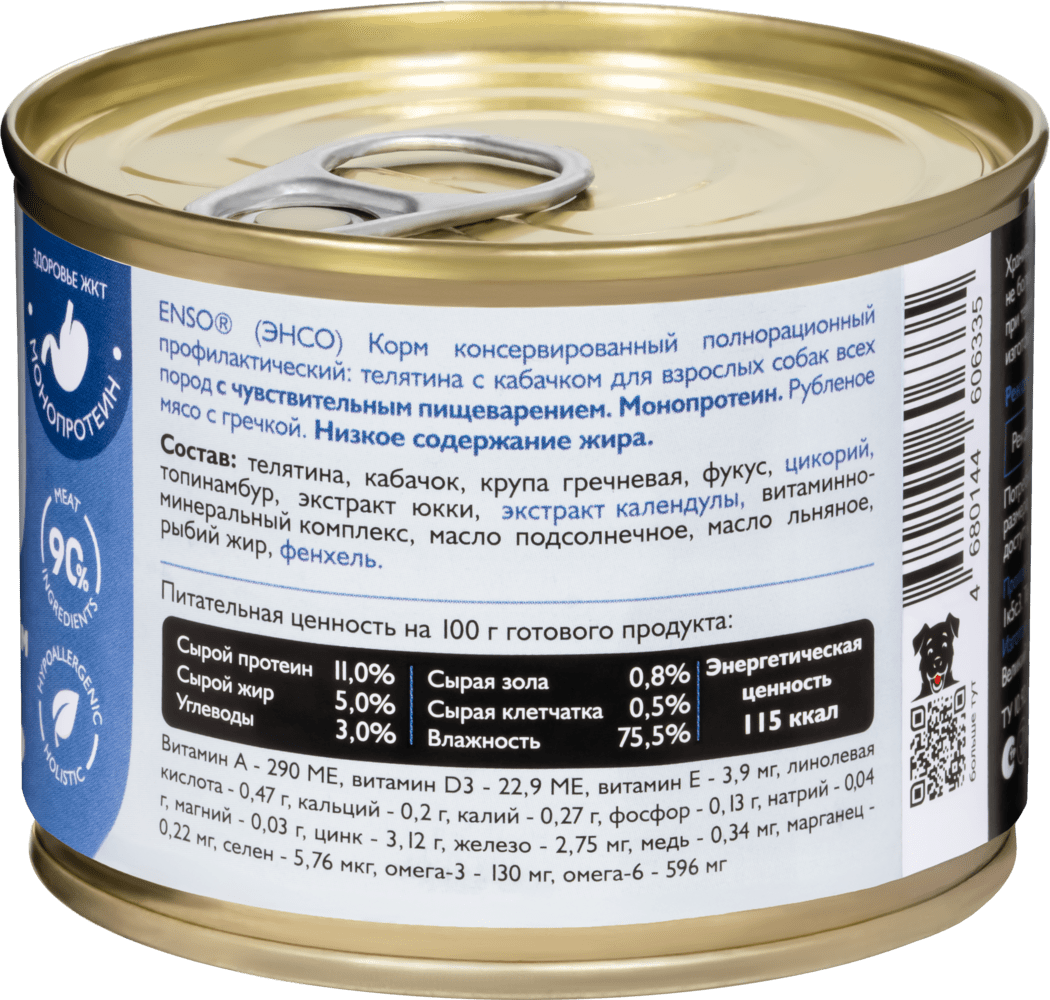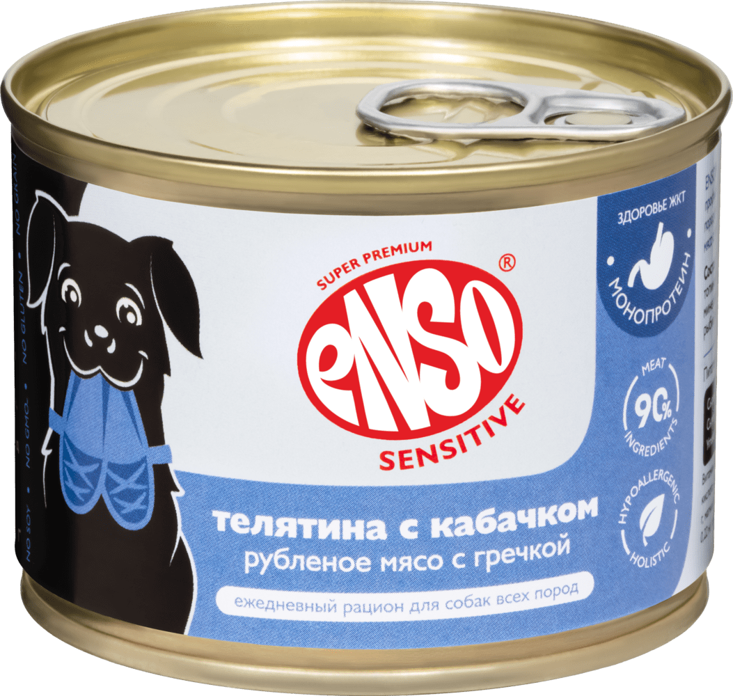 ENSO SENSITIVE консерва ж/б д/собак всех пород чув.пищ.низкожировой Телятина гречка кабачок 190гр*12