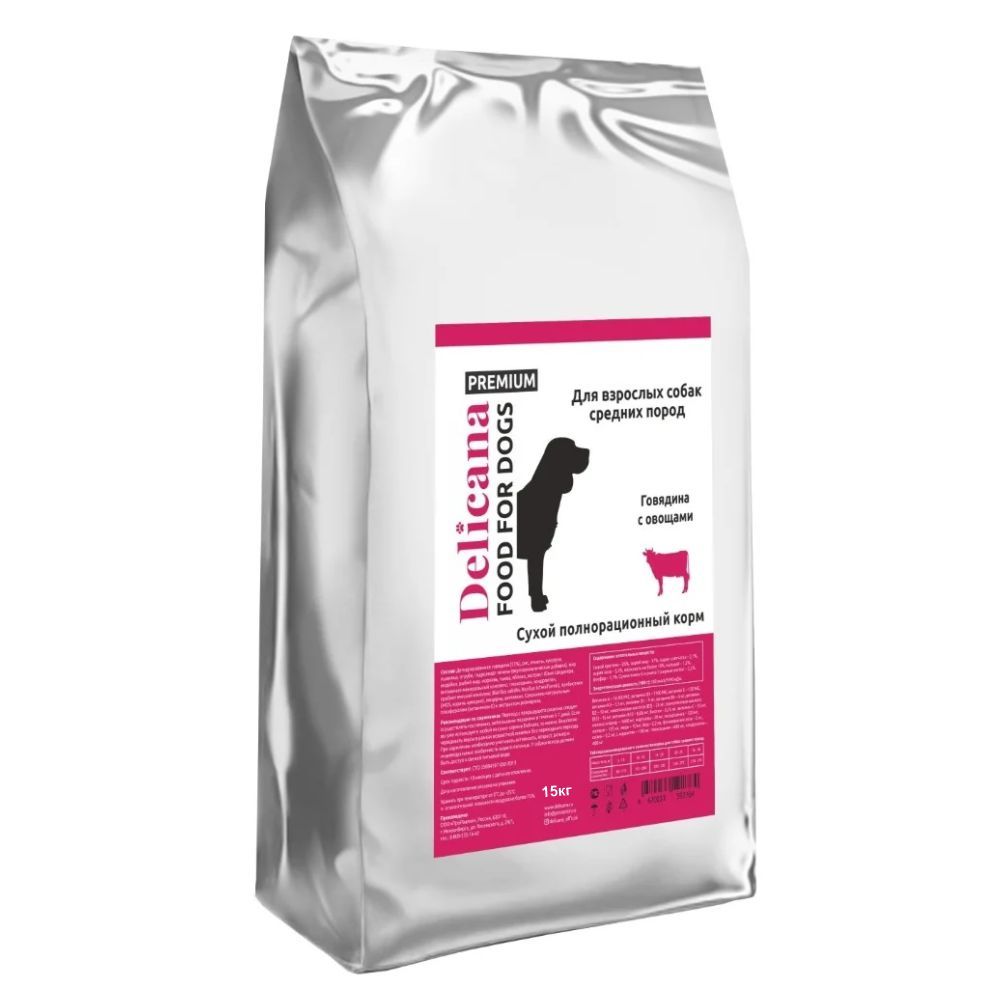 DELICANA СУХОЙ ПОЛНОРАЦИОННЫЙ КОРМ ДЛЯ ВЗРОСЛЫХ СОБАК СРЕДНИХ ПОРОД С ГОВЯДИНОЙ И ОВОЩАМИ, 15кг