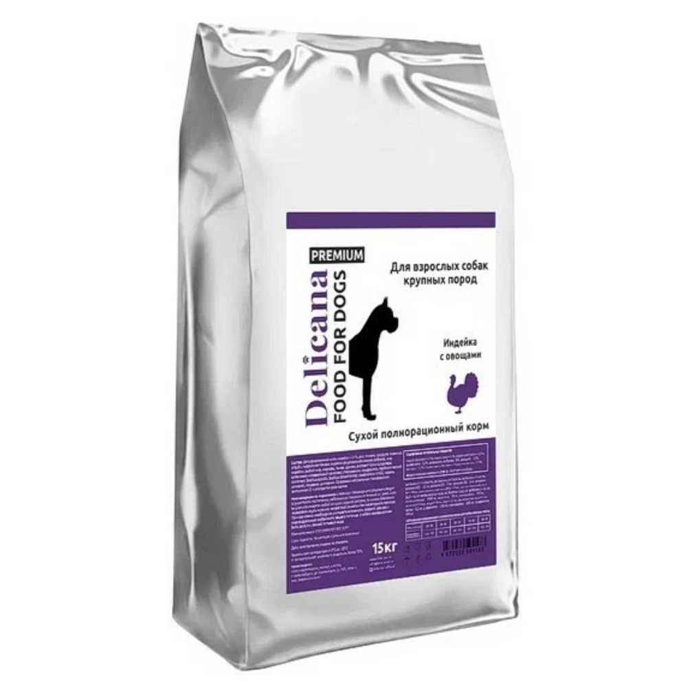 DELICANA СУХОЙ ПОЛНОРАЦИОННЫЙ КОРМ ДЛЯ ВЗРОСЛЫХ СОБАК КРУПНЫХ ПОРОД С ИНДЕЙКОЙ И ОВОЩАМИ, 15кг