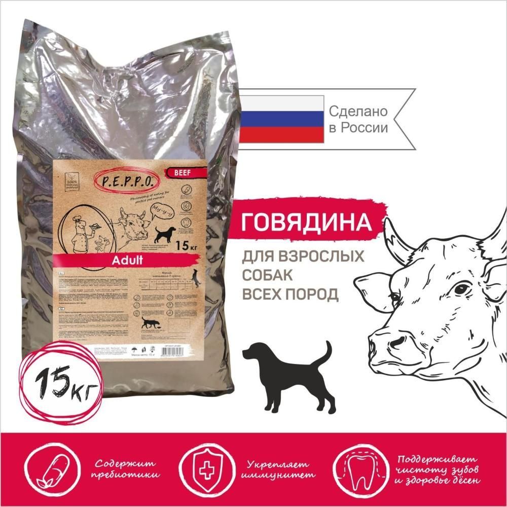 —Полнорационный сухой корм ПЕППО для взрослых собак всех пород, Эдалт, Говядина, 15 кг