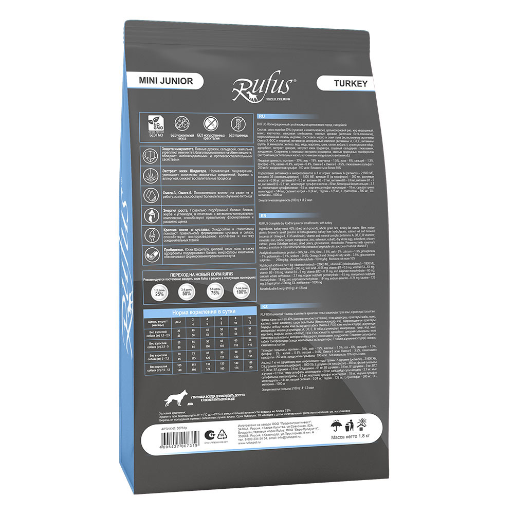 Пищевая ценность: протеин – 30%, жир – 19%, клетчатка – 1.5%, зола – 6%, кальций – 1.3%, фосфор – 1%, калий – 0.4%, натрий – 0.4%, Омега-3 и Омега-6 - 3.5%, глюкозамина сульфат - 250 мг/кг, хондроитина сульфат - 100 мг/кг. Влажность не более 10%.