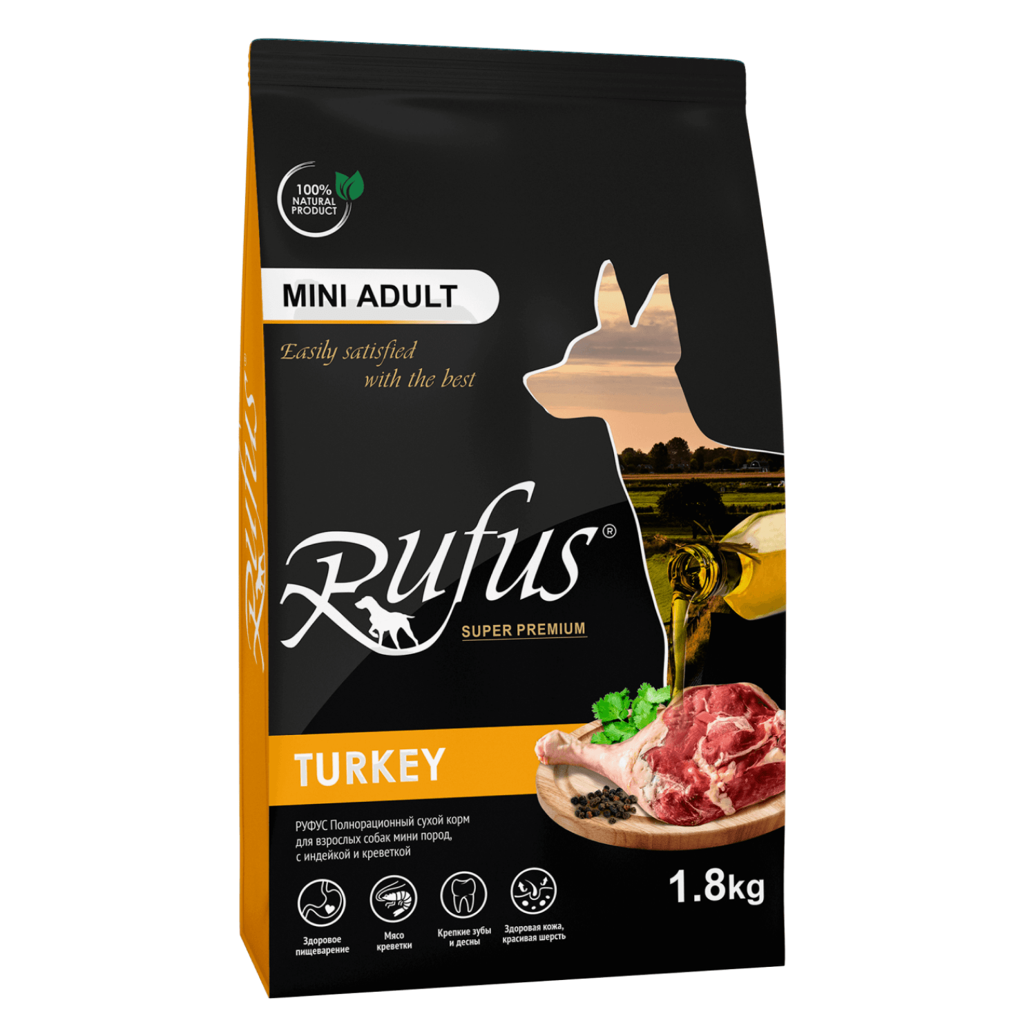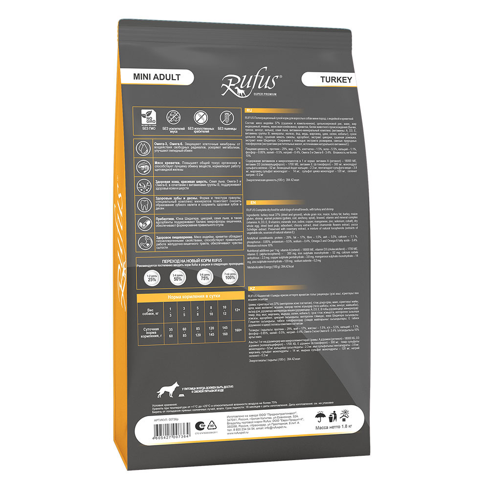 Полнорационный сухой корм Руфус для взрослых собак маленьких пород, Мини Эдалт, Индейка/Креветка, 1,8 кг