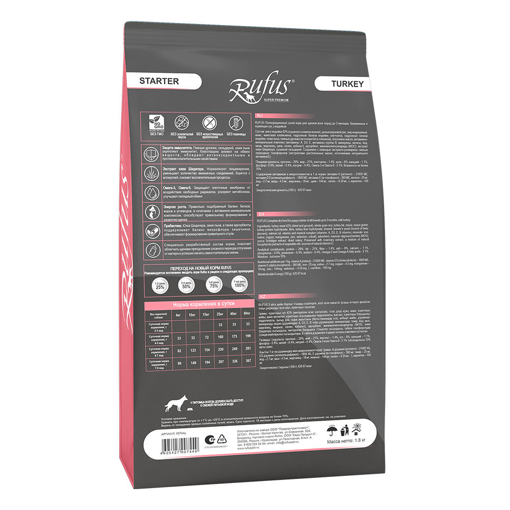 —Полнорационный сухой корм Руфус для щенков, Стартер, Индейка, 1,8 кг