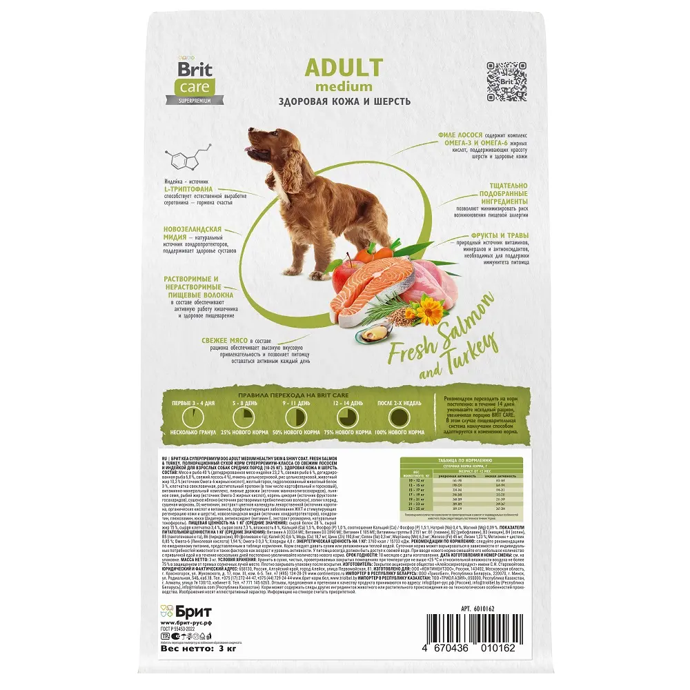 —БРИТ КЕА сух корм д/соб ср пород 3кг лосось и индейка Dog Adult Med Healthy Skin&Shiny Coat