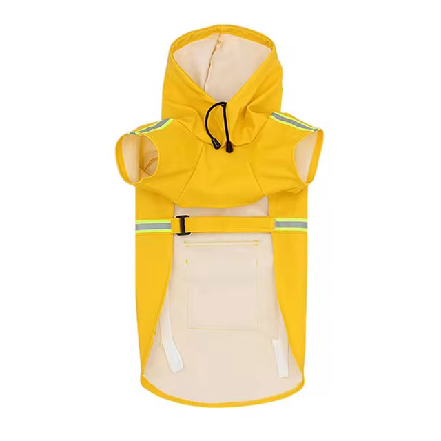 Непромокаемый материал сохраняет шерсть сухой, а удобная застежка на липучке делает процесс надевания быстрым и комфортным. Дождевик с капюшоном и удлиненной спинкой защищает даже в сильный дождь.