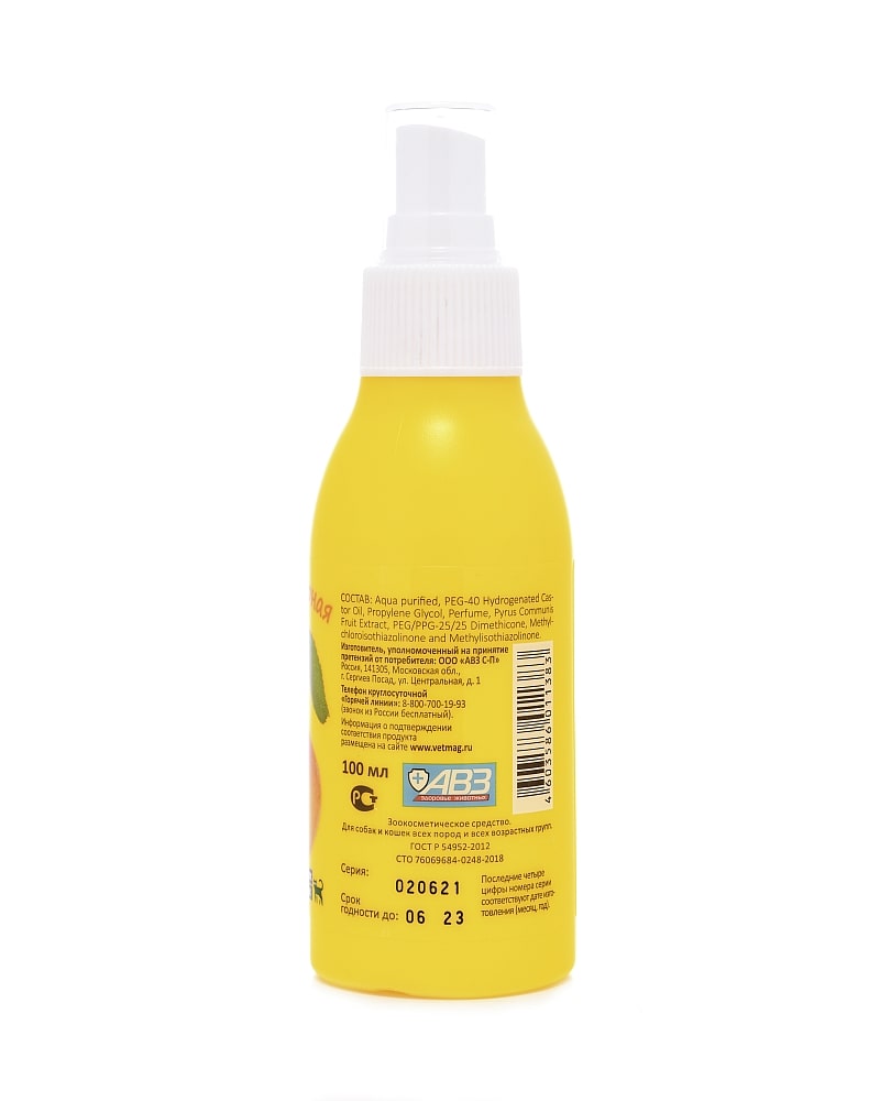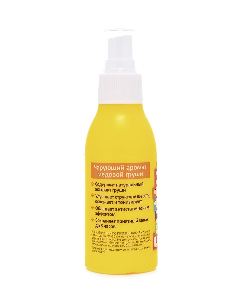 Устраняет неприятный запах с шерсти животного. Придаёт шерсти приятный ненавязчивый аромат медовой груши. Подходит для регулярного применения. Значительно улучшает состояние волосяного покрова, шерсть не слипается, не утяжеляется. Можно применять после укладки феном. Шерсть сохраняет естественный блеск и приятный запах до 5 часов. Способствует облегчению расчёсывания, уменьшает слипание и спутывание волос. Обладает хорошим антистатическим эффектом. Является отличным финишным средством для завершения груминга животных.