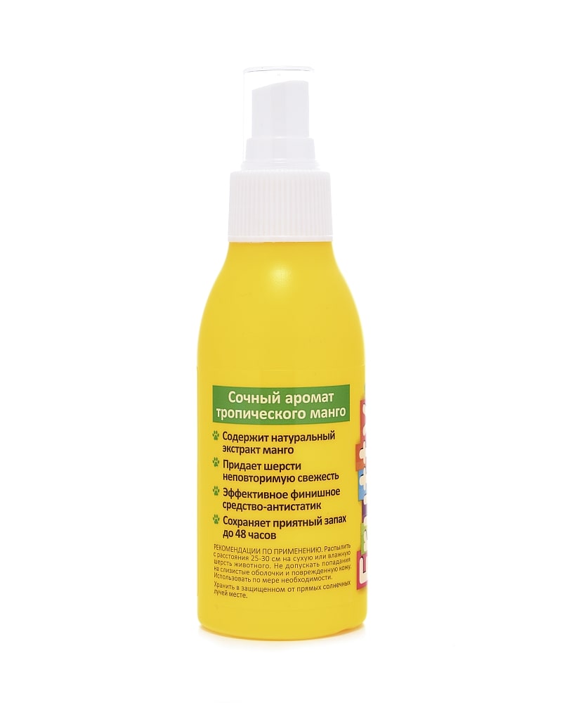 Устраняет неприятный запах с шерсти животного. Придаёт шерсти приятный ненавязчивый аромат тропического манго. Подходит для регулярного применения. Значительно улучшает состояние волосяного покрова, шерсть не слипается, не утяжеляется. Можно применять после укладки феном. Шерсть сохраняет естественный блеск и приятный запах до 5 часов. Способствует облегчению расчёсывания, уменьшает слипание и спутывание волос. Обладает хорошим антистатическим эффектом. Является отличным финишным средством для завершения груминга животных.