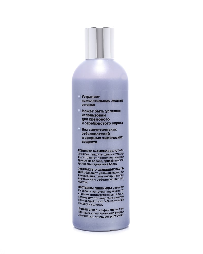 Предназначен для белой шерсти, но может использоваться для кремового, серебристого и даже черного окрасов. Устраняет нежелательные желтые оттенки. Не содержит синтетических отбеливателей и вредных химических веществ. Увлажняет кожу и шерсть, стимулирует рост волос, обеспечивает защиту цвета и текстуры, устраняет поверхностные повреждения волоса, придаёт шерсти прочность и здоровый блеск.