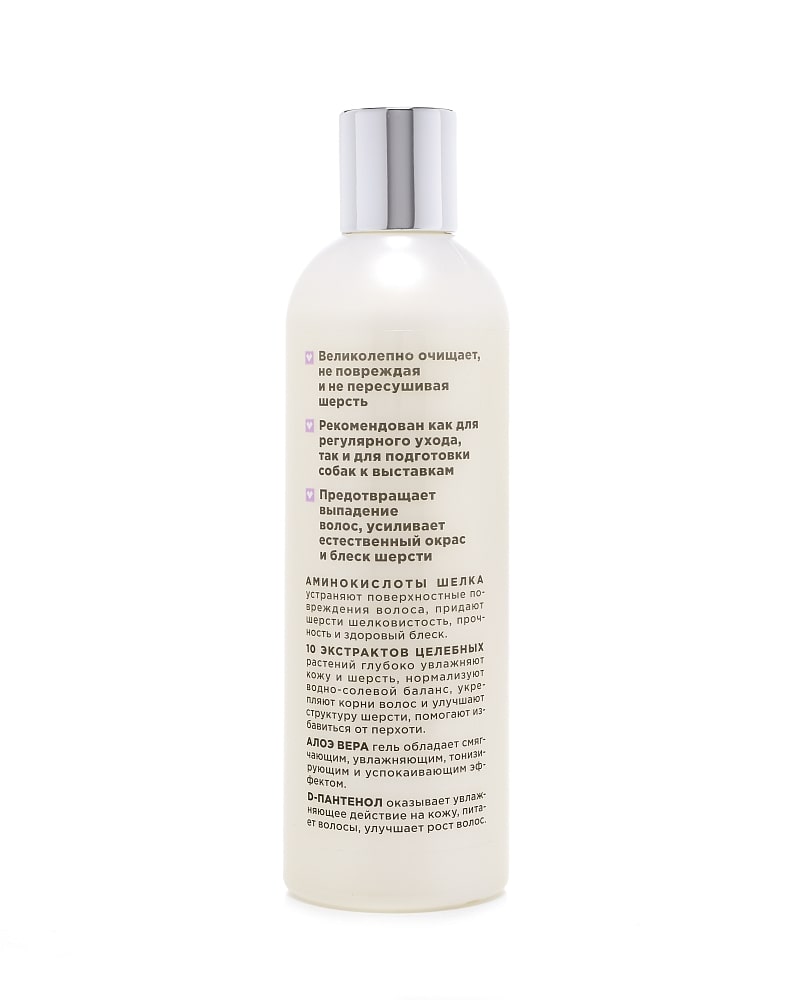 Обладает хорошими моющими свойствами, стимулирует обновление клеток эпидермиса, предотвращает выпадение волос, устраняет зуд и предупреждает появление перхоти. Увлажняет и питает шерсть, придает здоровый вид, укрепляет корни и препятствует выпадению шерсти, улучшает структуру, способствует легкому расчесыванию. Придает шерсти яркость и натуральный блеск.