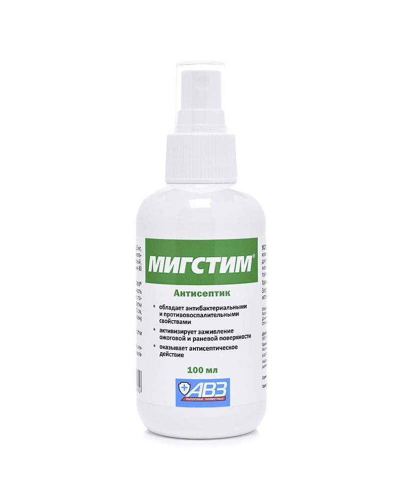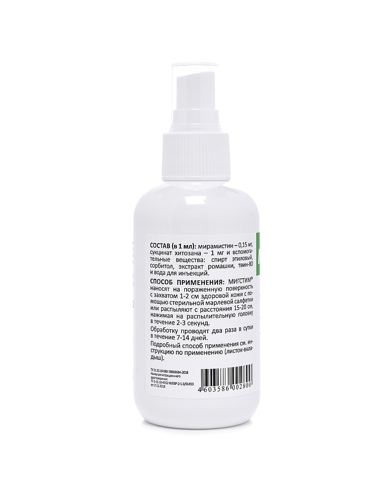 Состав и фармакологические свойства. В качестве действующих веществ содержит мирамистин – 0,015%, экстракт ромашки – 2%, сукцинат хитозана – 0,1% и спирт этиловый – 8 %. Мигстим относится к комбинированным антисептическим препаратам, активен в отношении большинства грамположительных и грамотрицательных патогенных микроорганизмов, включая синегнойную палочку, золотистый стафилококк, кандиды и хламидии.