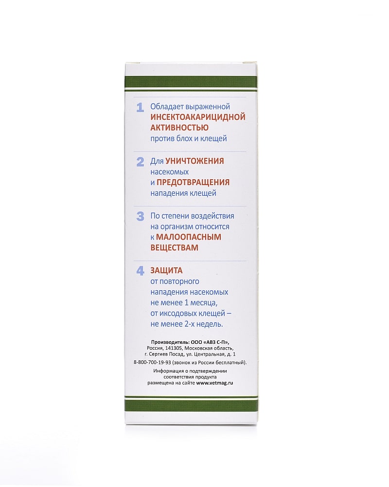Преимущества: -Высокая эффективность против клещей и блох. -Защита от насекомых 1 месяц, от клещей 2 недели. -Идеально подходит для обработки животного и мест его обитания. Противопоказания: Индивидуальная повышенная чувствительность животного к компонентам препарата (в том числе к фипронилу в анамнезе). Препарат не следует применять кормящим, больным инфекционными болезнями и выздоравливающим животным. Беременные и кормящие самки, котята моложе 10 недельного возраста. Содержит: фипронил.