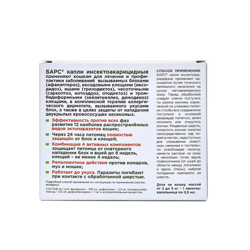 Преимущества: -Эффективность против всех фаз развития 12 наиболее распространённых видов эктопаразитов кошек; -Через 24 часа питомец полностью защищён от блох и клещей; -Комбинация 4 активных компонентов защищает питомца от повторного нападения блох и вшей до 8 недель, клещей – не менее 4 недель; -Репеллентное действие против комаров, мух и мошек. Противопоказания: Не подлежат обработке больные инфекционными болезнями и ослабленные кошки. Не следует мыть и купать животных с шампунем за 48 ч перед и 24 ч после обработки. Запрещается применение препарата БАРС® капли инсектоакарицидные котятам моложе 8-недельного возраста. Содержит: фипронил – 100 мг, цифлутрин – 2,5 мг, пиперонилбутоксид – 0,5 мг, дифлубензурон – 1 мг.