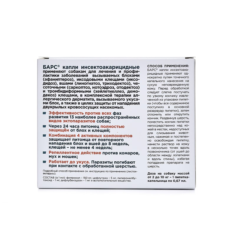 Преимущества: -Эффективность против всех фаз развития 13 наиболее распространённых видов эктопаразитов собак; -Комбинация 4 активных компонентов защищает питомца от повторного нападения блох и вшей до 8 недель, клещей – не менее 4 недель; -Репеллентное действие против комаров, мух и мошек. Противопоказания: Запрещается применение препарата БАРС® капли инсектоакарицидные щенкам и котятам моложе 8-недельного возраста. Содержит: фипронил – 150 мг, цифлутрин – 5 мг, пиперонилбутоксид – 1 мг, дифлубензурон – 1 мг.