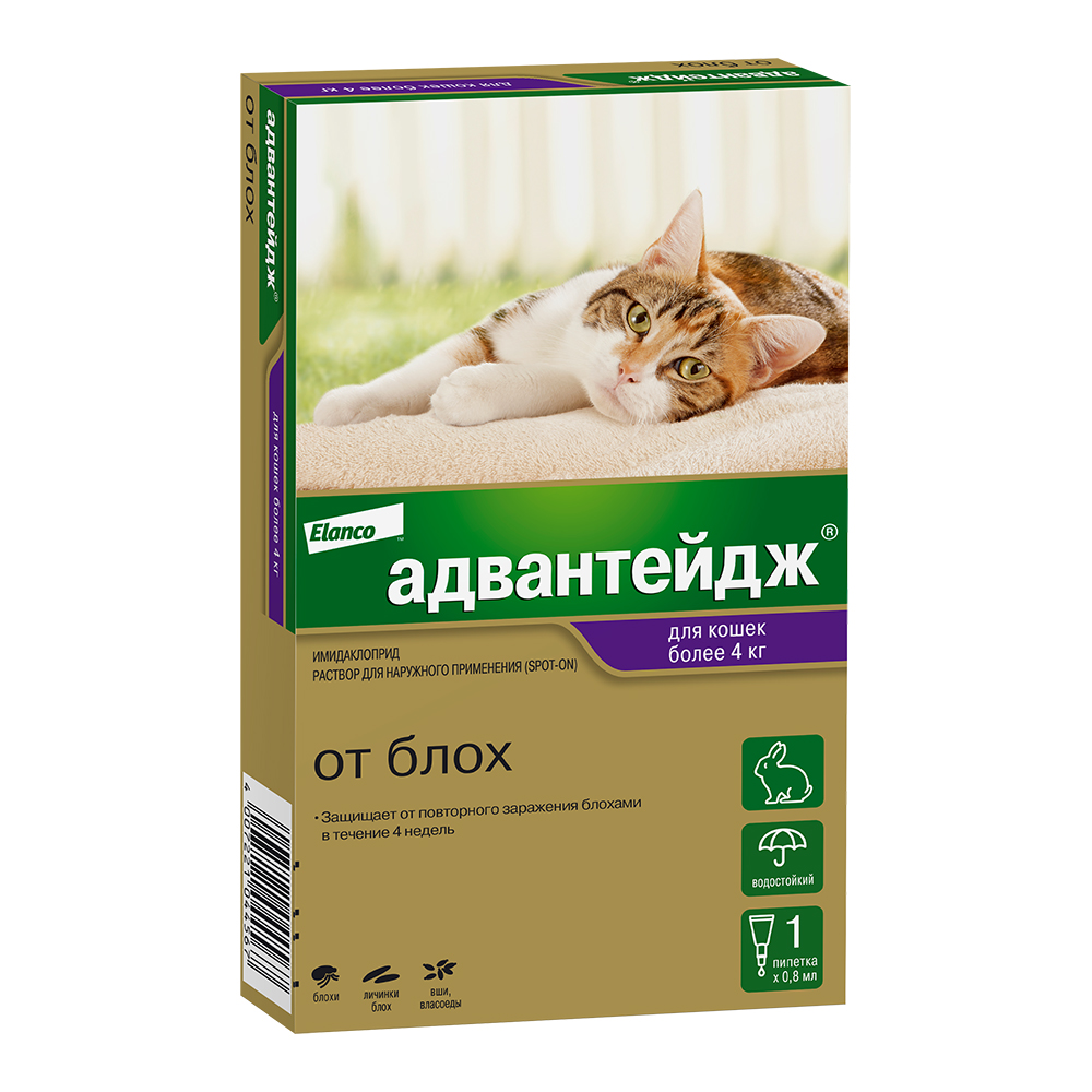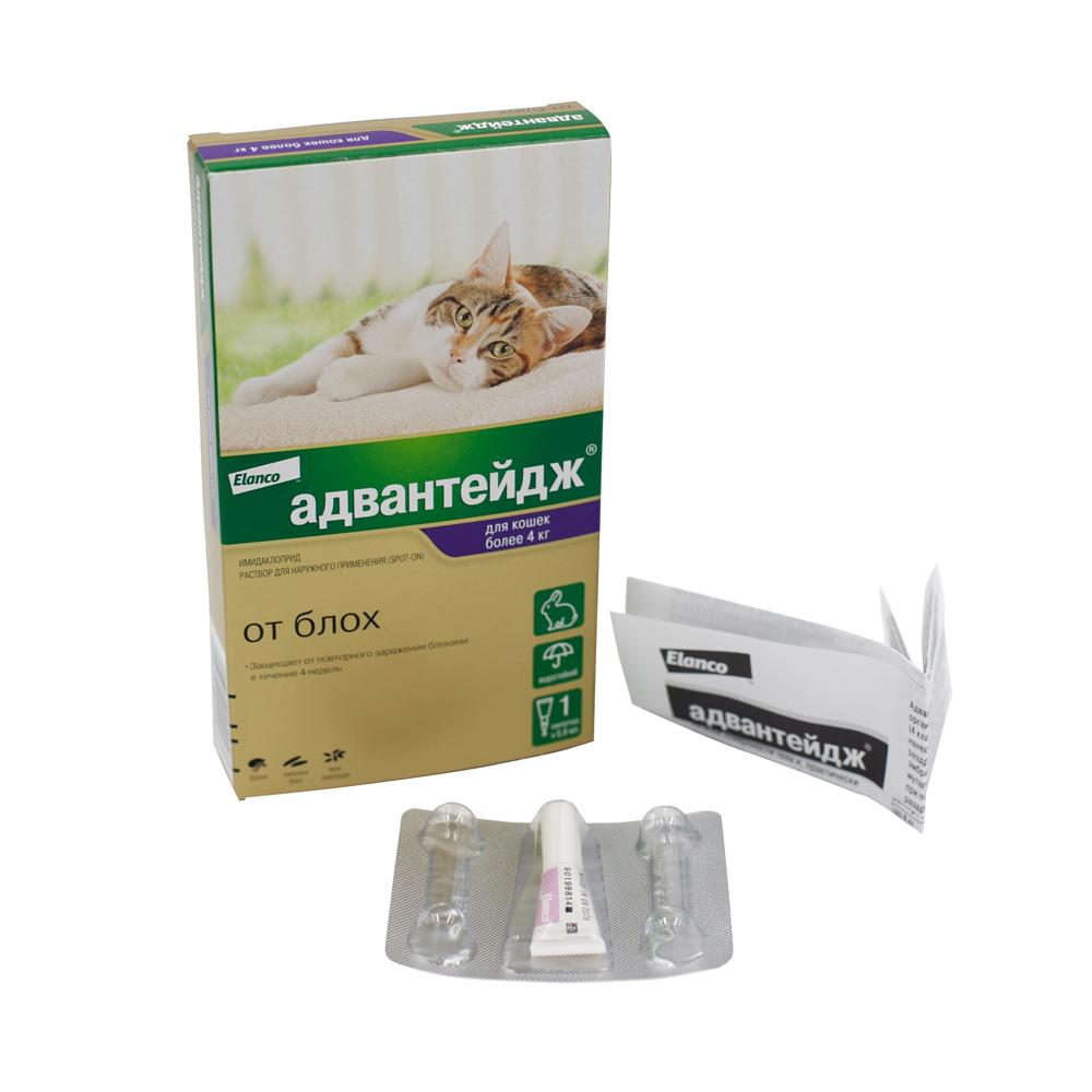 Адвантейдж® помогает защитить кошек от блох, их укусов, снижая риск передачи переносимых ими заболеваний. Капли от блох Адвантейдж® содержат действующее вещество имидаклоприд, которое начинает действовать на блох уже в течение 3-5 минут после контакта.