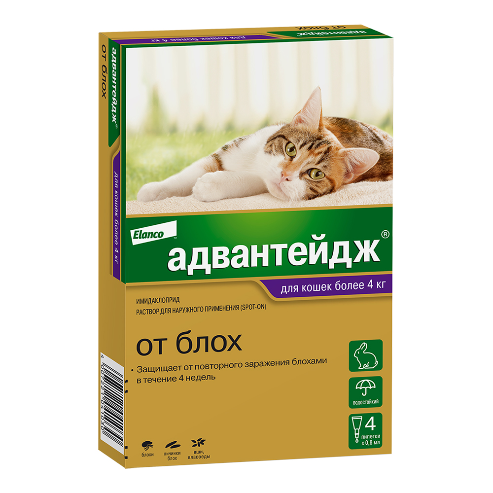 Адвантейдж® помогает защитить кошек от блох, их укусов, снижая риск передачи переносимых ими заболеваний. Капли от блох Адвантейдж® содержат действующее вещество имидаклоприд, которое начинает действовать на блох уже в течение 3-5 минут после контакта.